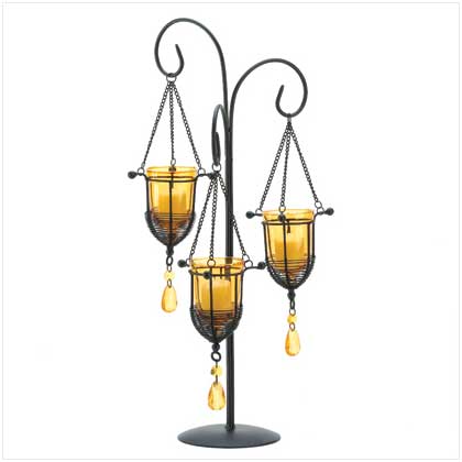 - Amber Crystal Drop Candelabra. Sunset colors dazzle with the warmth of captured light, turning this graceful stand into a blaze of beauty! Artfully fashioned from matte black metal with golden-amber glass candle cups.